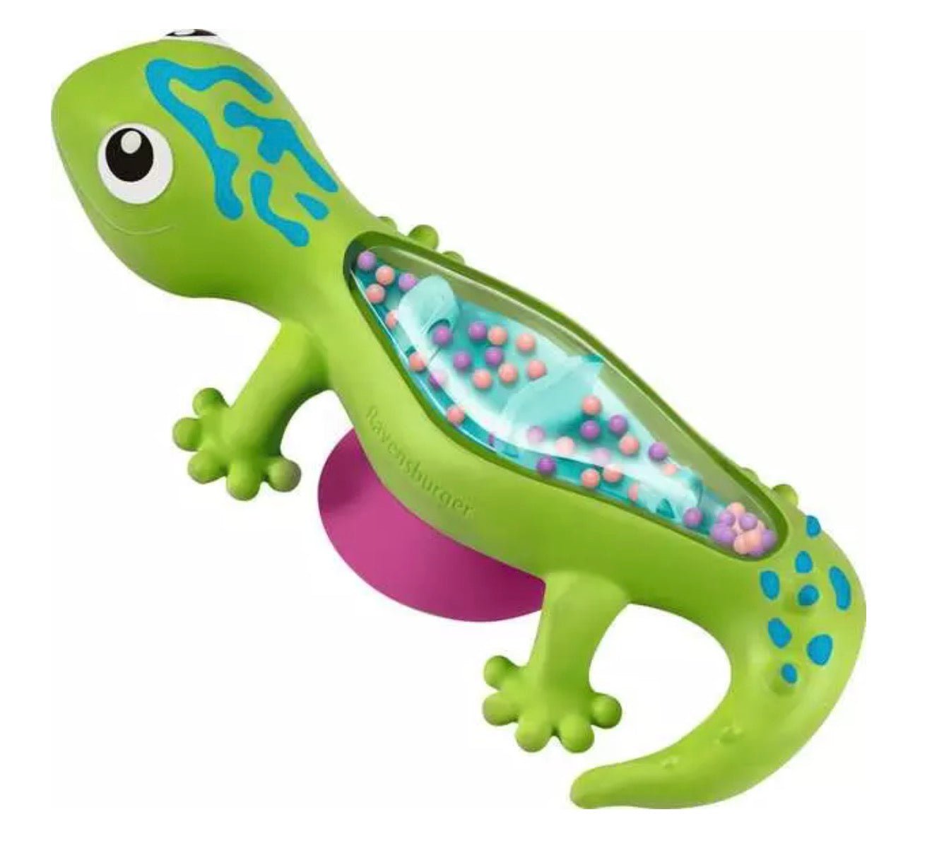 A fun friend for bath time, changing time and mealtime, this bright gecko rainmaker toy can be secured to any smooth surface using the handy suction cup. As little hands twist the gecko, baby will be rewarded with the sounds of gentle rain as the brightly coloured beads cascade through the toy. His chunky, waterproof body will make him a bath time favourite and the soft rain sounds can provide soothing play at bedtime too.