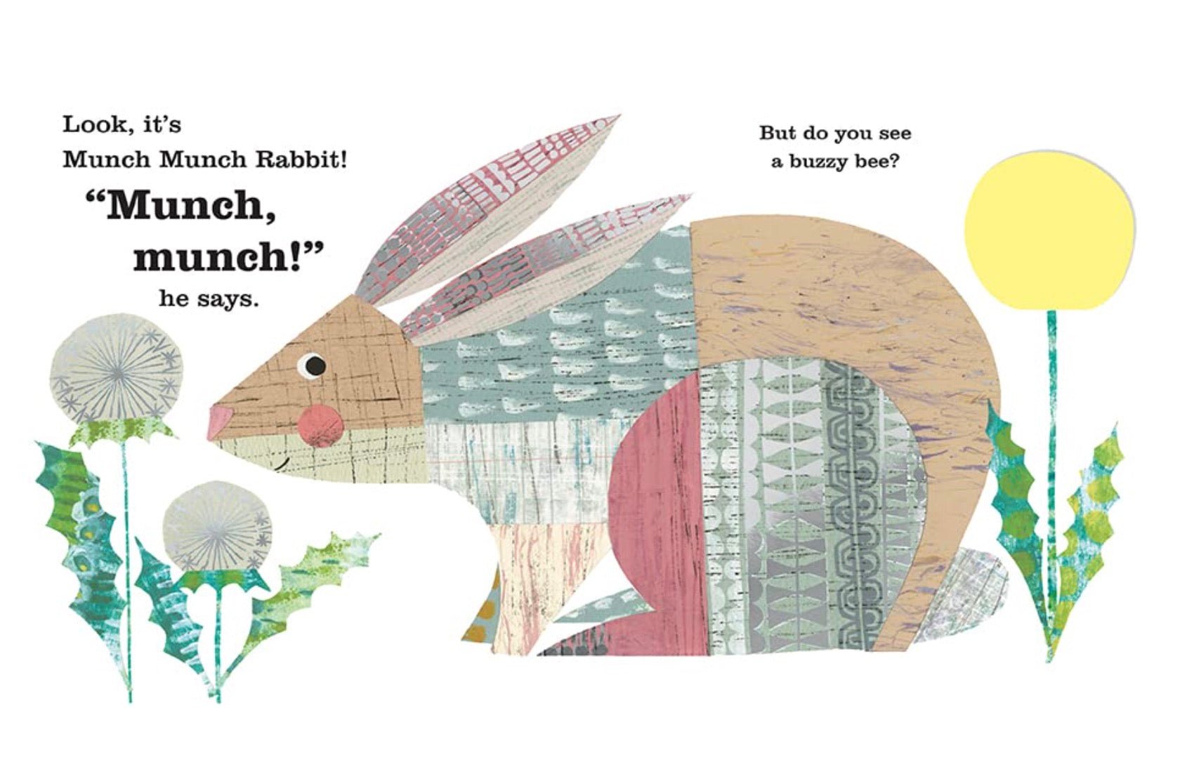 Pre-schoolers will adore Clare Youngs’s friendly animals with their high-contrast collage artwork, decorative foil highlights, and signature animal noises—but there’s a tiny creature to find behind a tuggable felt flap, too! In this book, you’ll meet Munch Munch Rabbit, Glub Glub Fish, Quack Quack Duck, and Woof Woof Dog herself. With a final “recap” page of animal noises, and the question, “But what noise do YOU make?,” little readers will enjoy lifting the last flap and saying “hello” to themselves in the surprise mirror!