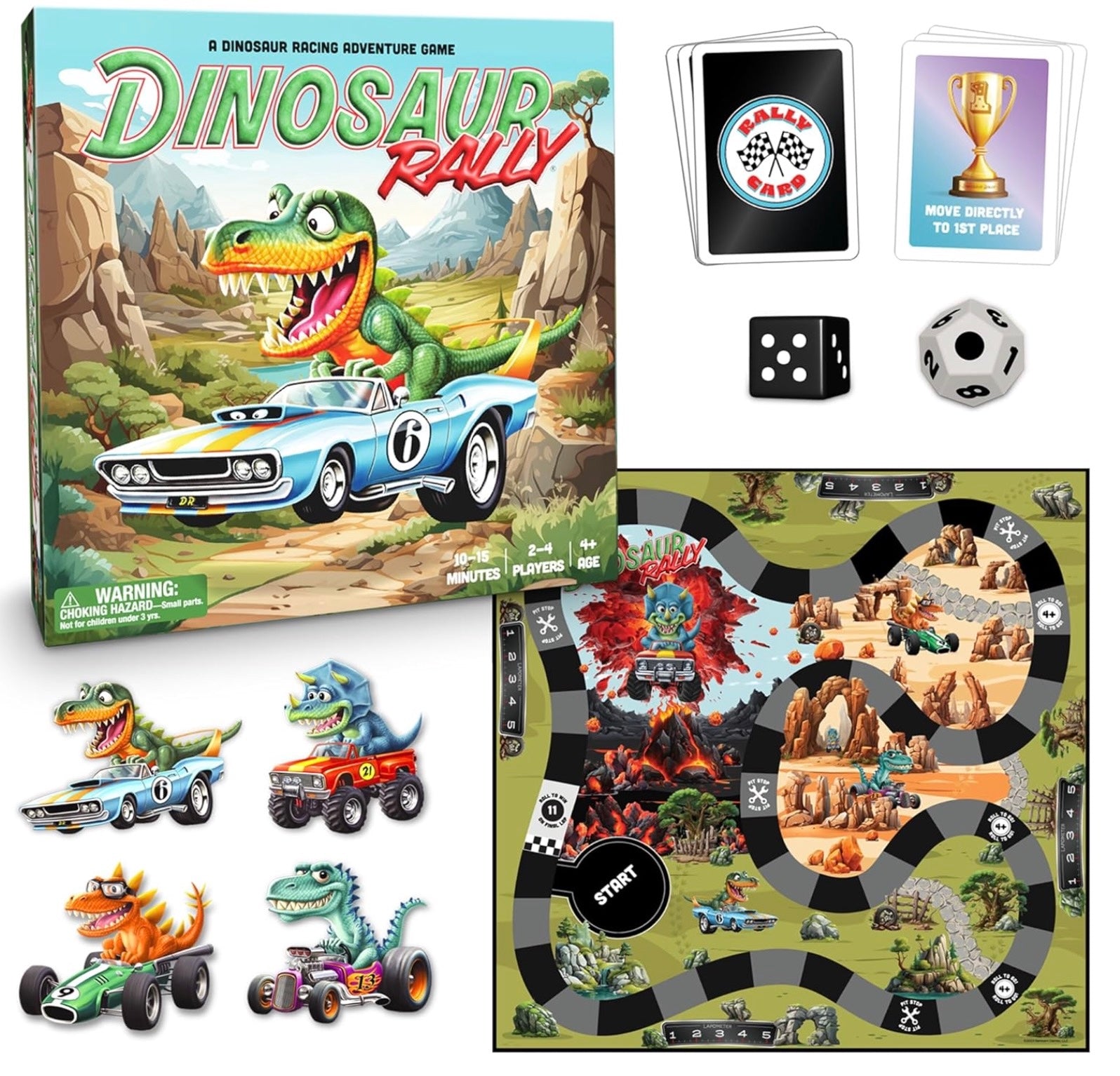 - Thrilling Dinosaur-Themed Adventures: Race through vibrant prehistoric landscapes with Dinosaur Rally! This captivating kids board game immerses families in a world of dinosaurs and cool cars, perfect for young explorers and classroom activities.