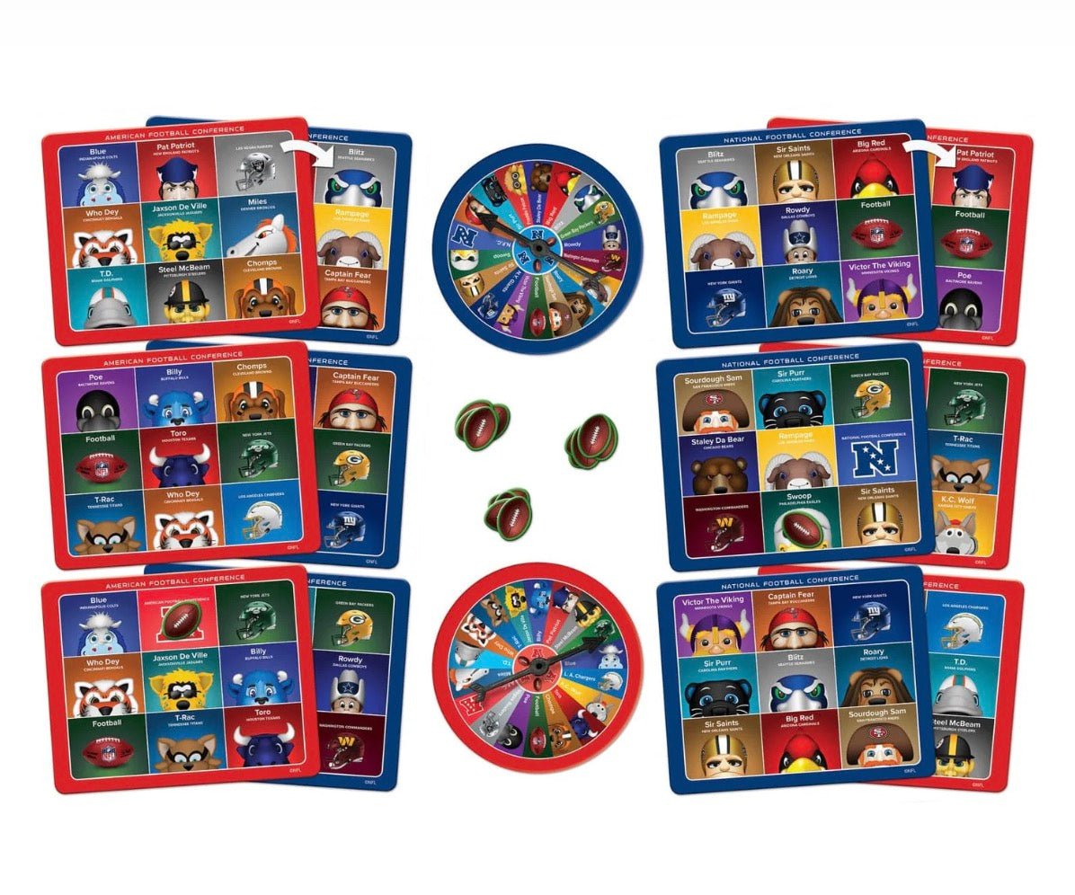 العب البنغو مع تميمة NFL الشهيرة! تتميز هذه اللعبة بتميمة NFL الشهيرة التي تتميز بفن تميمة S. Preston البسيط. قم بإجراء جميع المباريات التسع وكن أول من يصرخ بـ BINGO! تتضمن لعبة البنغو MasterPieces هذه 2 دوارة و6 لوحات لعب مزدوجة الجوانب و84 رمزًا. اختر 6 لوحات ودوارة لمؤتمرك المفضل!