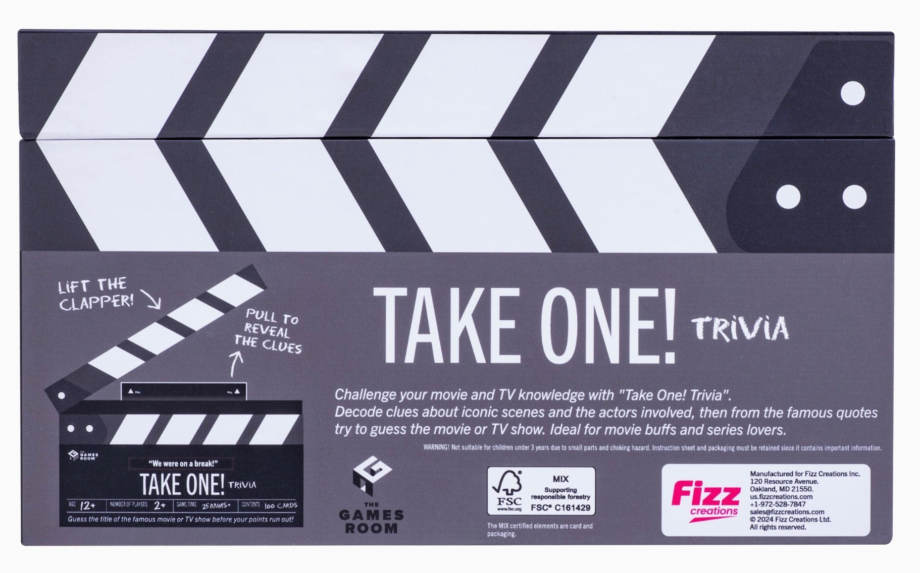 Put your pop culture expertise to the test with Take One! Trivia! This fun game challenges players to guess the title of iconic movies and TV shows based on cleverly crafted clues. Lift the clapper and pull to reveal hints about memorable scenes, famous quotes, and legendary actors. With 100 cards full of exciting trivia, it’s a must-play for movie buffs and series enthusiasts alike. Whether it’s a family game night or a gathering with friends, this game is the perfect way to show off your silver-screen knowledge! - Guess the Title: Decode clues to identify famous movies and TV shows. - Interactive Play: Lift the clapper to reveal hints about scenes, quotes, and actors. - 100 Trivia Cards: Packed with challenges for movie buffs and series lovers. - For All Players: Designed for 2+ players and 25+ minutes of gameplay. -Perfect for Game Nights