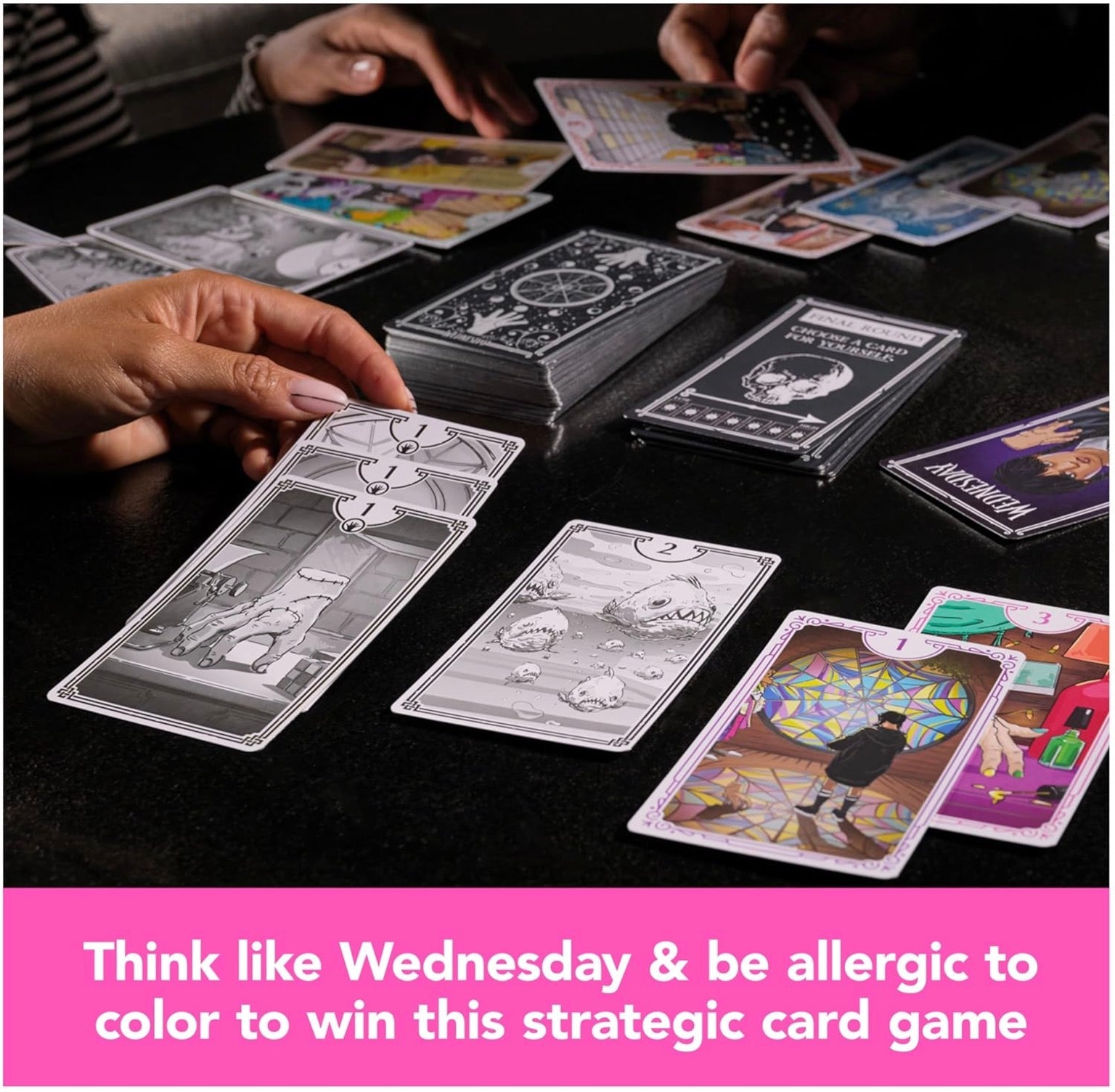 - BEAUTIFUL NIGHTMARE CARDS: Premium foil decorated cards include imagery directly related to Wednesday characters & scenes from the show that fans will love. Play with 3+ players ages 10+.