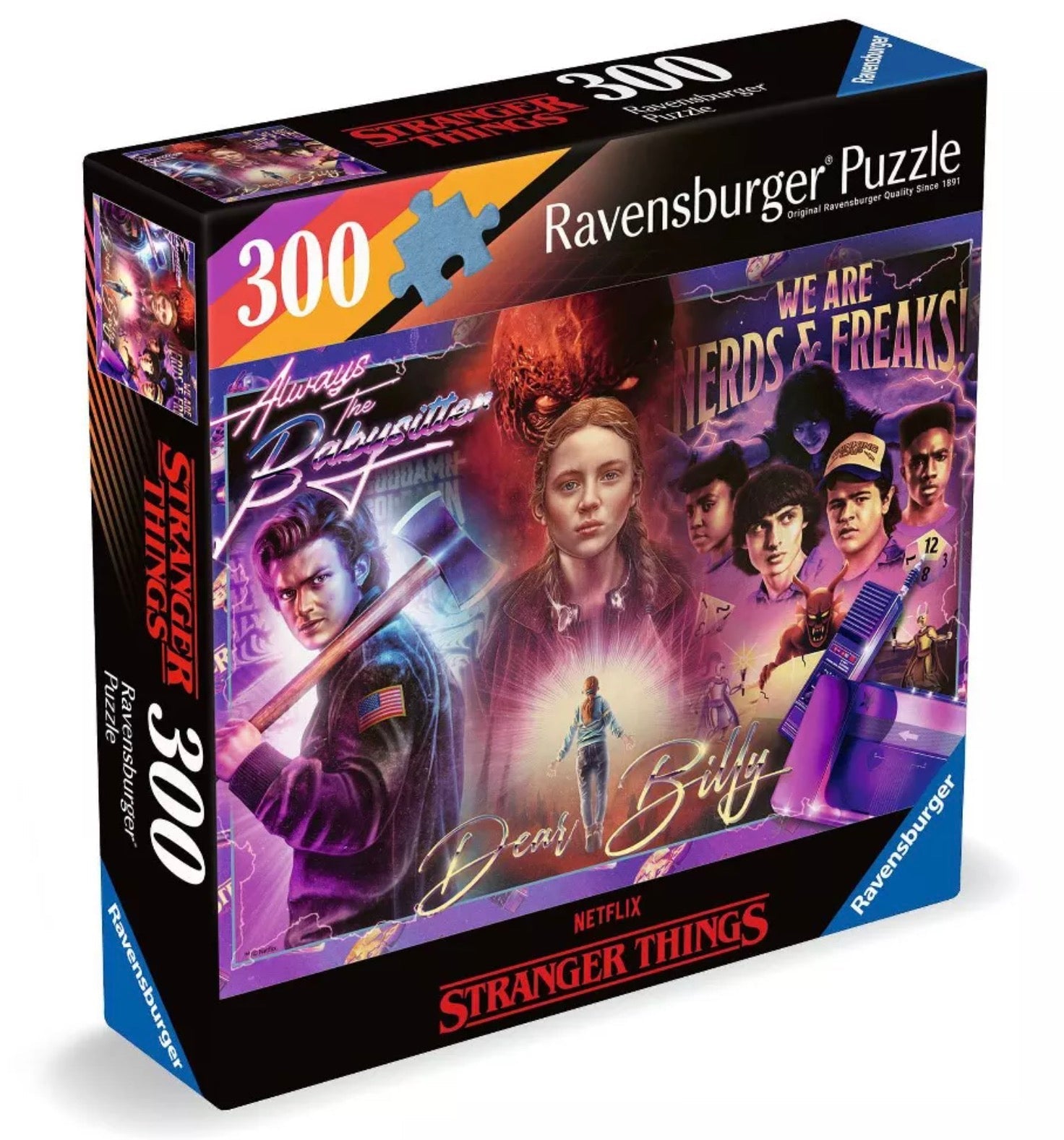 Embark into the upside-down world of Hawkins, Indiana with our 300-piece puzzle featuring favorite characters from the hit Netflix series “Stranger Things!”