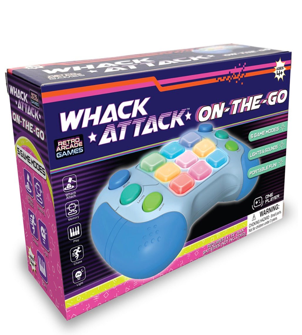 Embrace 80's nostalgia with this handheld version of a blast from the past: Whack Attack! Kids (and adults!) release extra energy and build focus as they follow the flashing lights in 5 different 1-player games. Choose from hamster, memory, chase, light, and music modes. Volume and lights are adjustable and players can even pause the game! Great after school, travel, or pre-dinner entertainment. Requires 3 AAA batteries, not included.