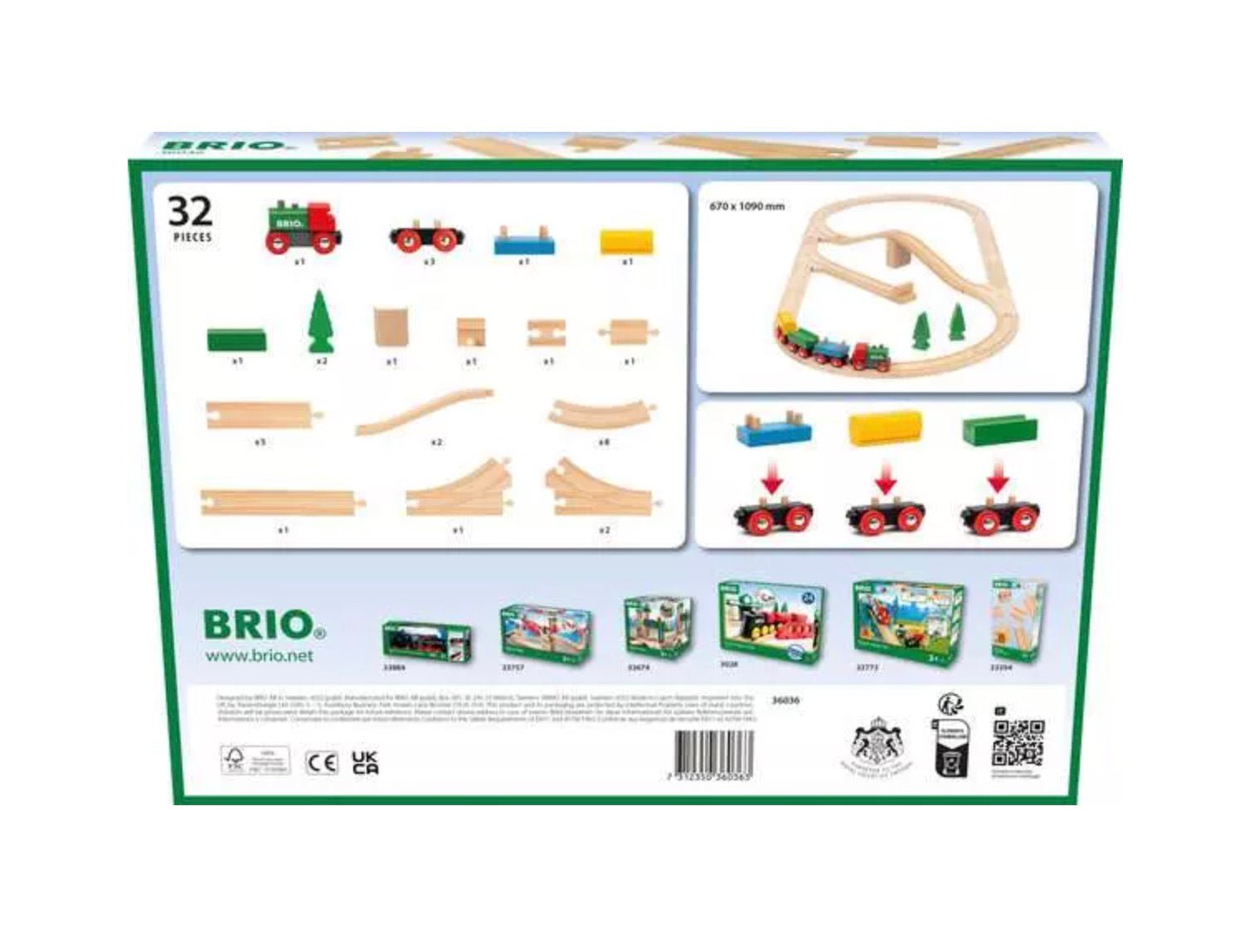 Celebrate classic railway play with the 36036 65th Anniversary Train Set. This all wooden train set takes inspiration from our iconic BRIO railway products first launched in 1958. The 32 piece set is made from FSC® (FSC-C111262) certified European beech wood and includes a classic BRIO train with 3 wooden wagons in bright colours, bridge, switching tracks and wooden trees for scenic decoration.