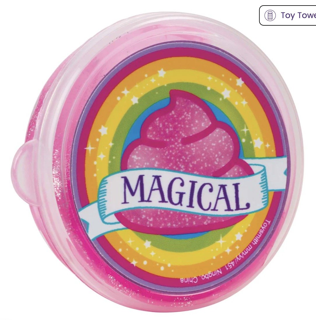 This best-selling colorful fake poop slime toy is designed for laughs. Unicorn Poop is a reusable slime putty that comes in hot pink mixed with shimmering glitter. Designed for tactile and visually pleasing experiences, this toy is individually packaged on a 4.75 x 6.625-inch rainbow and unicorn-illustrated peggable blister card. Made with nontoxic materials, this nonstick putty is uniquely designed for repeated squishing and stretching. Get individually packaged Unicorn Poop putty cards with a hot pink and yellow display.