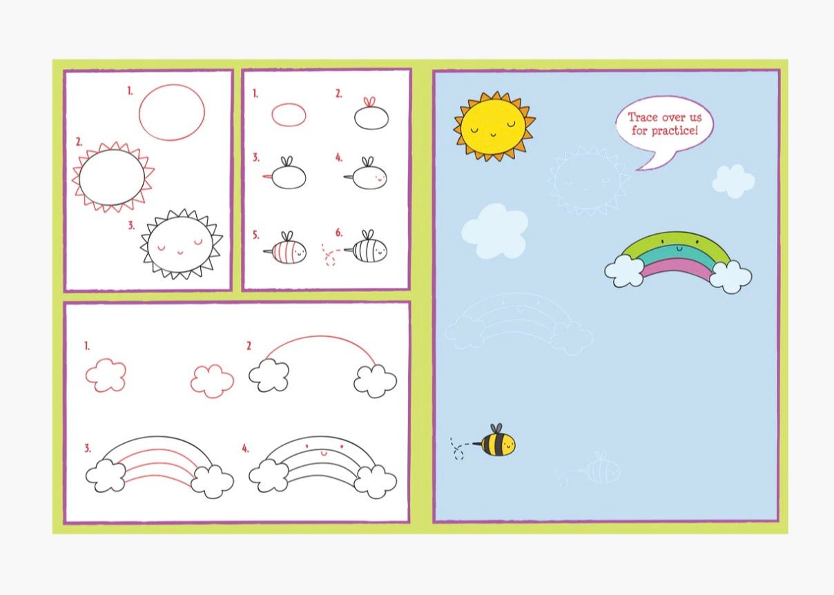 هل أنت مستعد لرسم... كل أنواع الأشياء اللطيفة؟ قوس قزح، شمس، سحب، نحل، وغير ذلك الكثير؟ هذا الكتاب من أجلك!