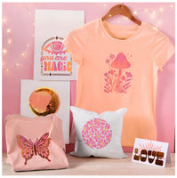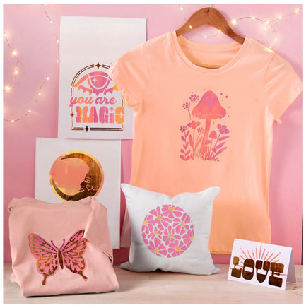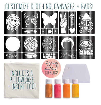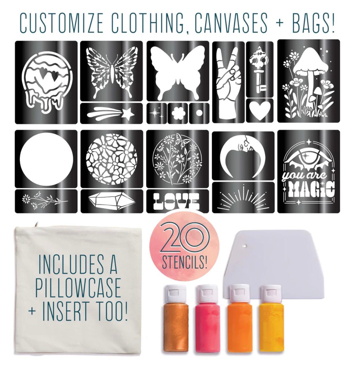 It’s easy to customize a pillow, shirt, tote bag and more! The sticky stencils let you print your beautiful designs with crisp edges. Comes with reusable sticker stencils, 4 colors of fabric paint including bronze and all the supplies you need, including a pillow and pillowcase! Choose from 20 stencils featuring mushrooms, butterflies, a moon, wildflowers and more. Create boutique-worthy art and wearables! Comes with pre-cut fabric "posters" to try out your skills. When you're confident, use your own t-shirts and fabrics to make memorable fashion statements.