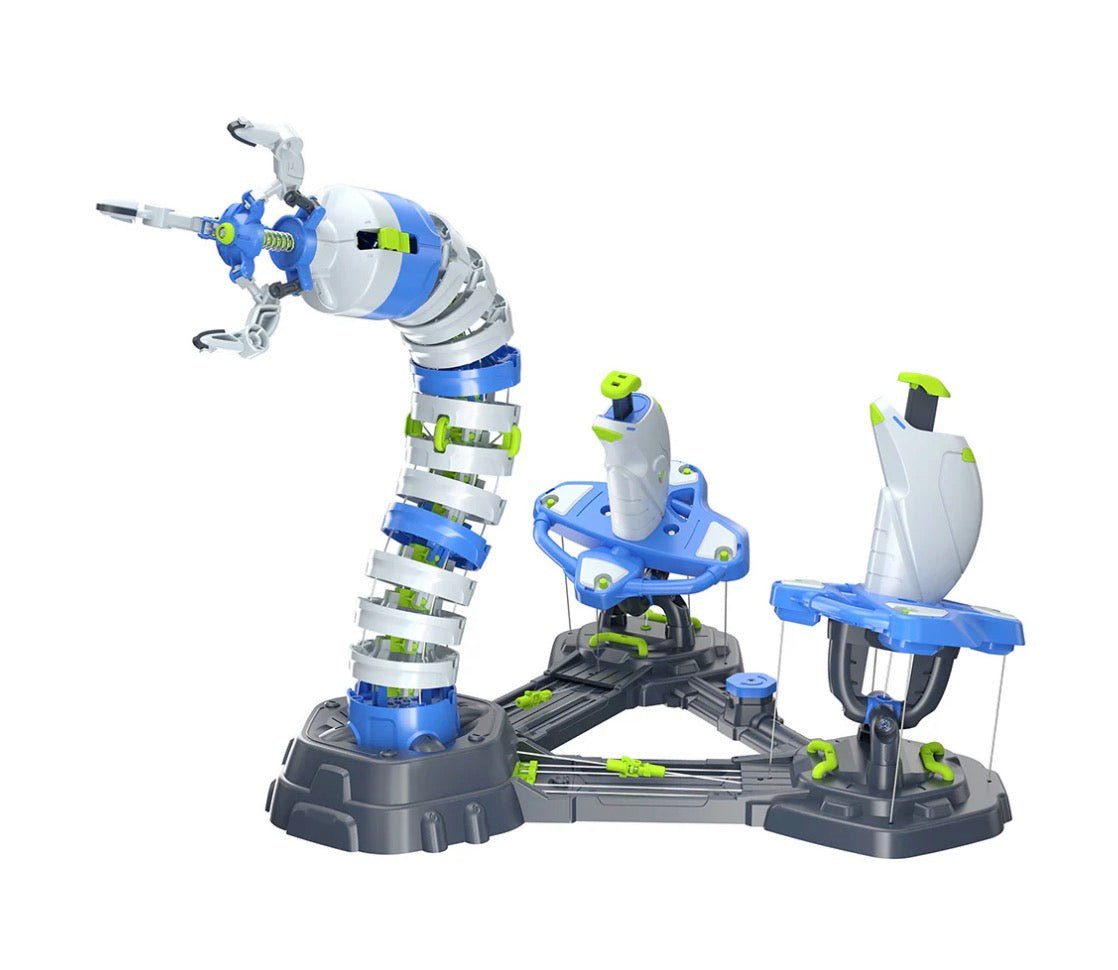 Just a touch of the right button rotates the claw up to 180 degrees, while pressing the left button gives you the power to open and close the claw. Move the two joysticks and push the two buttons to maneuver the claw to grab, move, and release various objects. Using this robotic arm feels like being at the controls of a state-of-the-art remote operating robot or high-tech cleanroom. And it’s all controlled by the power of your hands — no motors or electricity required!
