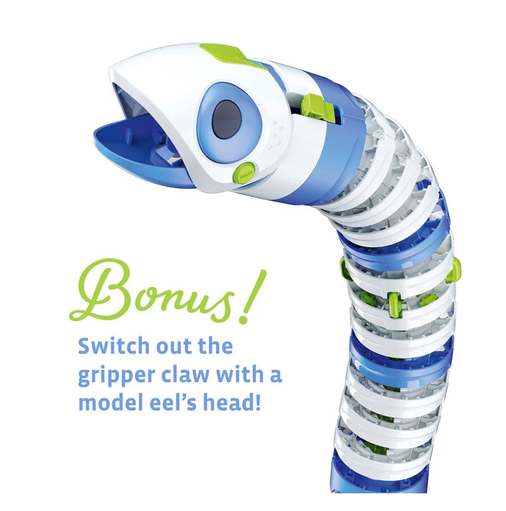 - Two interchangeable end effectors (gripper claw and fun eel head)