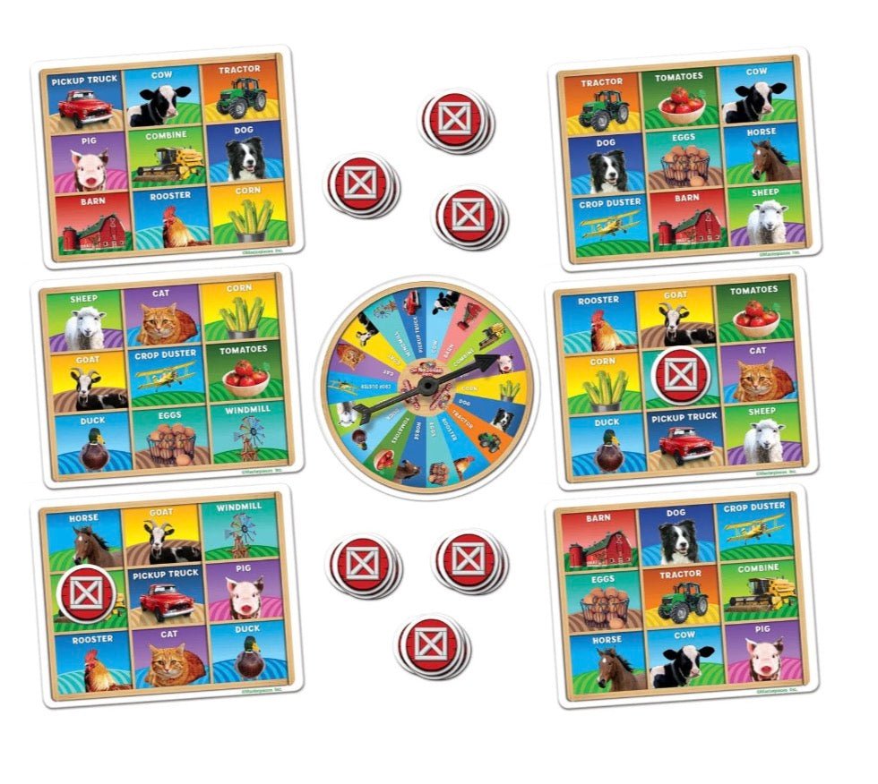 Play bingo with your favorite farm animals and fresh foods. Old MacDonald's Farm Bingo Game puts a farm spin on the family favorite. Make all 9 matches and be the first to shout BINGO! This MasterPieces Bingo Game includes 1 spinner, 6 gameboards, and 60 custom tokens. For 2-6 players. Perfect for ages 3 and up.