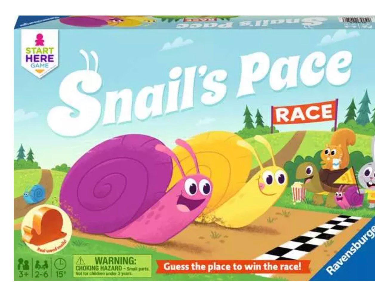 Snail's Pace Race is an early learning game for children ages 3 and up. Ravensburger's Snail's Pace Race is an early learning game designed to introduce preschoolers to the basics of board game play without the pressure of direct competition. Snail's Pace Race is a cooperative, non-competitive game. This no-reading, quick-play game features six brightly-colored wooden garden snails that players move across a colorful game board according to the roll of the dice. Players move six colorful snail game pieces along the path of the game board, each starting from their matching colored leaf. Players roll the dice to move the snails forward along their color path until they reach the last spot in their color. Snail's Pace Race introduces children to basic board game rules such as turn-taking, patience, dice-rolling and piece movement. Players also get to practice their counting, color-matching, memory, and social skills. Bright Artwork and Bold Designs Engage Children. The carved wooden snail-shaped playing pieces provide a tactile appeal and help deepen players' connection to the game. What's In The Box? 6 wooden snails, 2 colored wooden dice, 1 playing board, 1 set of instructions.