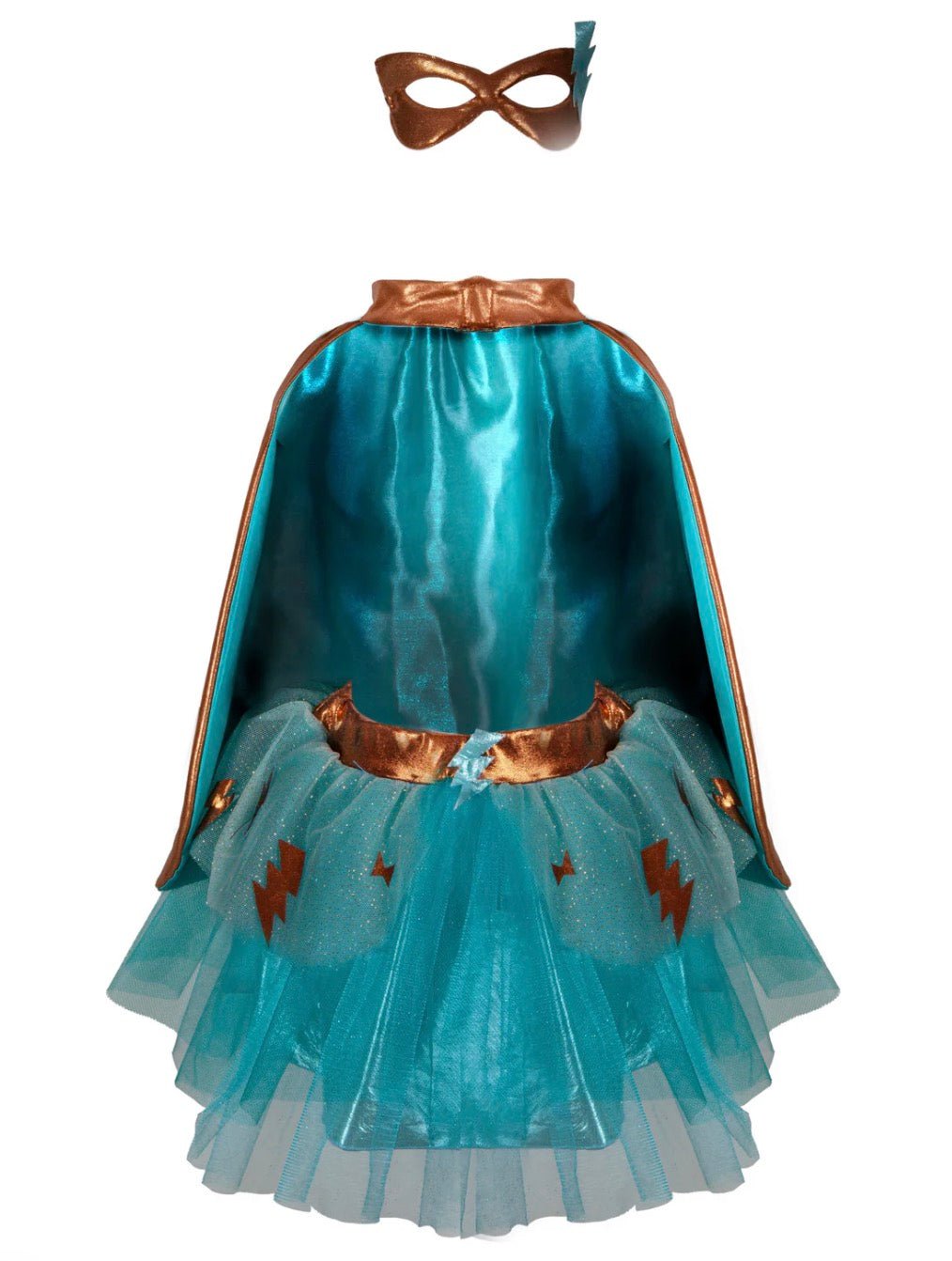 Super Duper Tutu, Cape, & Mask Sets are an AMAZING 3-pc Super Sets! These designs could be superhero or rock star outfits! Waistbands are fabric wrapped for a nice finish & comfort (no scratching here). The emblems on the back of the capes are embroidered around the edges for a nice finish. The copper & teal cape has a large glitter star on the back of the cape, which is lined for a complete elegant finish. There are star and lightning bolt accents on the skirts with a small pc of round felt on the back to hold them securely to the tulle. The skirts have a peplum and two layers of tulle with a fantastic crinkle metallic bottom lining layer. The masks are double sided and have a lightning bolt feature to match the set perfectly.