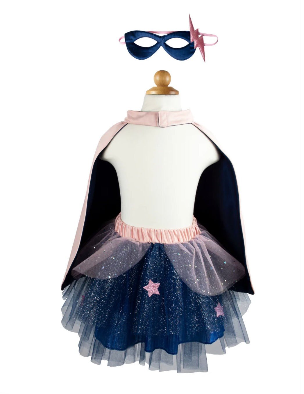 Super-Duper Tutu, Cape, & Mask Sets are AMAZING 3-pc Super Sets! These designs could be a superhero or rock star outfits! Waistbands are fabric wrapped for a nice finish & comfort (no scratching here). The emblems on the back of the capes are embroidered around the edges for a nice finish. The pink & navy cape has a pink glitter lightning bolt on the back! The cape is lined for a complete elegant finish. There are star and lightning bolt accents on the skirts with a small pc of round felt on the back to hold them securely to the tulle. The skirts have a peplum and two layers of tulle with a fantastic crinkle metallic bottom lining layer. The masks are double-sided and have a lightning bolt feature to match the set perfectly.
