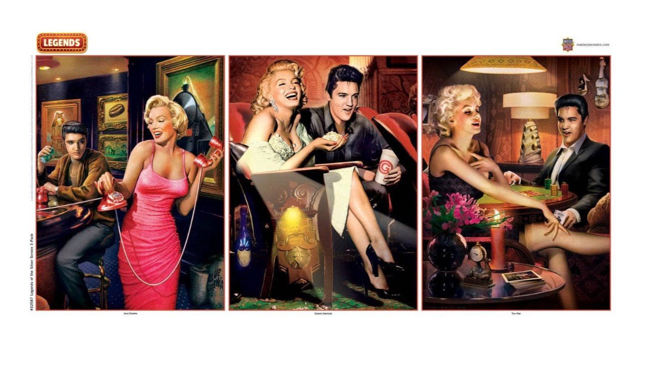 This three-pack of 500-piece puzzles celebrates the timeless allure of two iconic legends: Elvis Presley and Marilyn Monroe. Each puzzle brings to life the charisma and glamour of these beloved stars, featuring striking scenes of Elvis in his rock ‘n’ roll heyday, and Marilyn Monroe in her most iconic Hollywood moments. With vibrant details that capture their unique style and larger-than-life personas, this collection is perfect for fans of classic cinema and music who want to relive the magic of these legendary figures while enjoying a fun and nostalgic puzzle experience.
