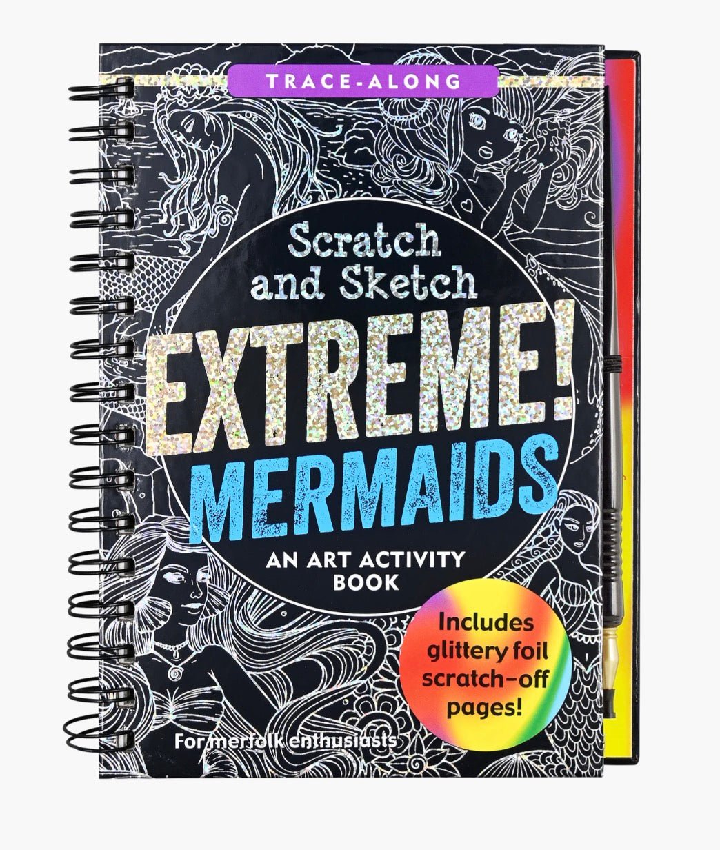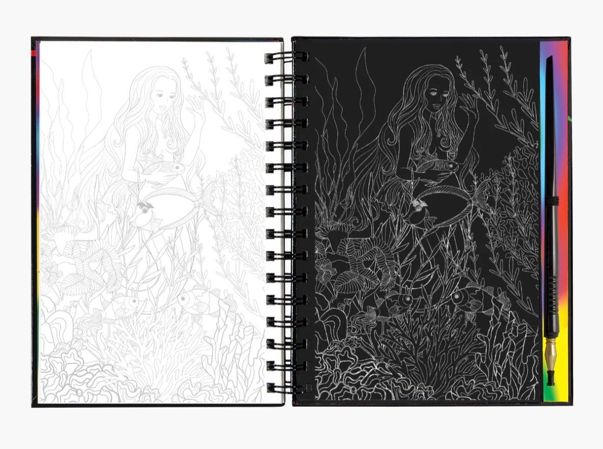 - Use the super-fine stylus included to trace the white lines on each right-hand black-coated page, uncovering mermaid designs that sparkle and shine in gold, silver, teal, or rainbow glitter!