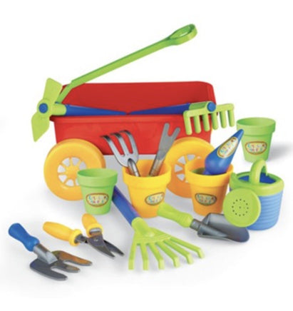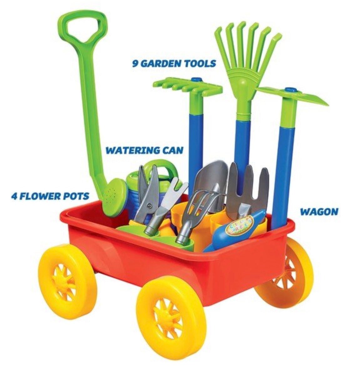 - Set includes gardening wagon, 9 garden tools, 4 flower pots in two sizes and watering can