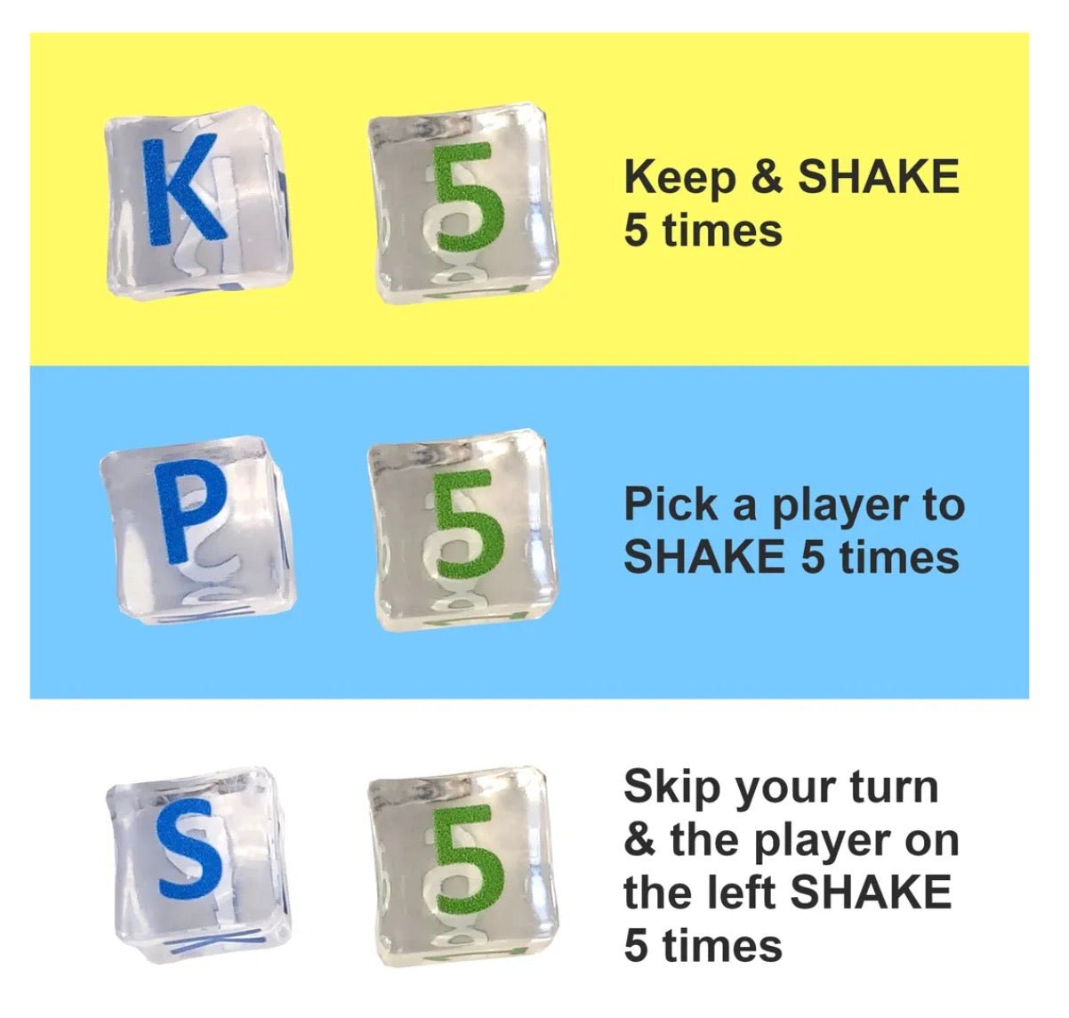 - STAY DRY, STAY VICTORIOUS: It is a dice rolling game which includes two "ice shaped" dice. The first die determines how many times you need to shake the soda can. And the second die determines whether you keep your turn, skip your turn or pick a player to take your turn. A fun game of strategy and chance as the two dice add an element of anticipation and create a dynamic gameplay experience!