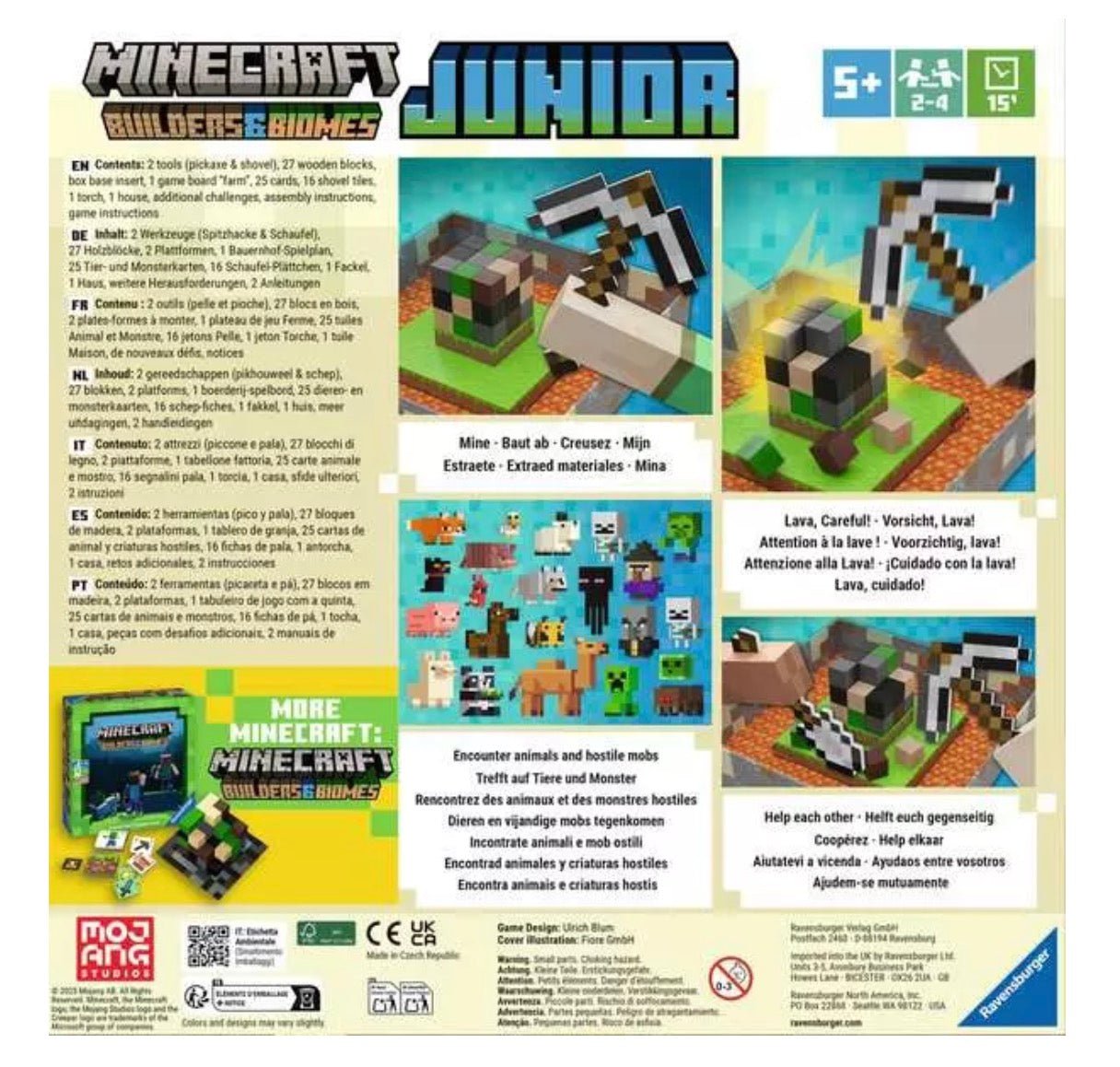 The cooperative children's game for the popular Ravensburger board game "Minecraft Builders & Biomes"! Build a farm together and give the animals a nice home. Use the pickaxe and shovel to skillfully collect blocks to build stables for the animals. But be careful not to drop any blocks into the lava! Monsters will also get in your way ... Finish building your farm before too many monsters reach your farm!