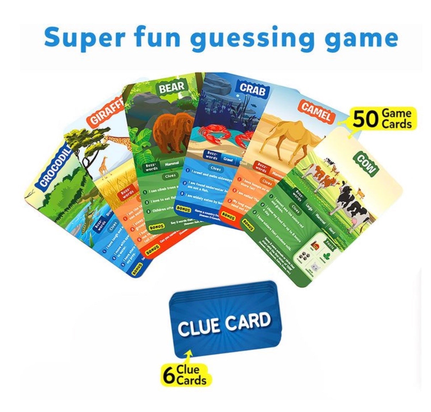 Get ready to play the most exciting game of questions! Ask up to 10 questions to guess the animal on the card. Think hard, ask intelligent questions, use your clue cards wisely & be the first person to win 7 game cards!