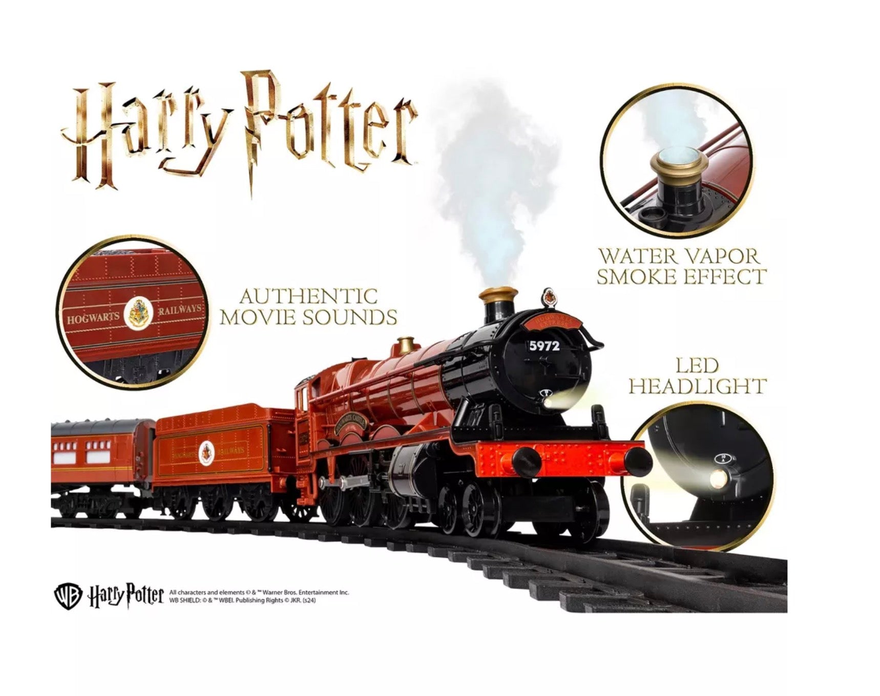 Step through Platform 9 3/4 and take a ride on the Hogwarts Express! Witches, wizards, and Muggles can easily control this battery powered, remote controlled train set. Featuring authentic sound clips of the beloved Harry Potter characters, this 37 piece train set is sure to delight boys and girls of all ages!