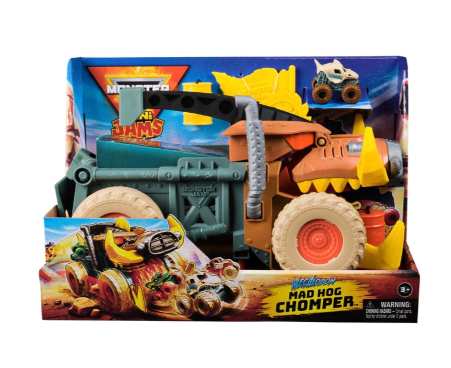 Unleash the Monster Jam madness with the Monster Jam Mini Jams Megalodon Mad Hog Chomper! Designed for young fans aged 3 and up, this playset brings a thrilling twist to both playtime and cleanup. Featuring an epic Mad Hog Chomper, Megalodon truck in 1:87 scale and 2 barrels! Use the epic Mad Hog Chomper to chomp up your Mini Jams Monster Jam trucks for easy storage. This not only keeps the living room tidy but also makes cleanup an exciting part of the game. Each launch and chomp introduces kids to cause and effect while fostering fine motor skills through active play. Fully compatible with all 1:87 scale Mini Jams trucks, the possibilities for creative play are limitless. Gift the Megalodon Mad Hog Chomper to the young Monster Jam fan in your life and watch them delight in the fun of scooping up their monster trucks time and again, making this Monster Jam playset a favorite for both play and putting away!