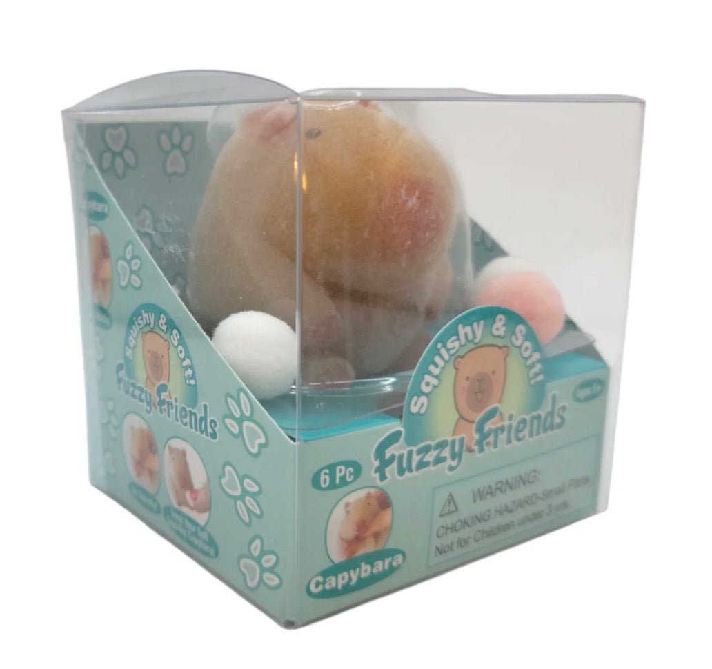 Super squishy, lightly fuzzy, jiggly jelly and cute as a button Capybaras come with 2 little fuzzy balls and accessory. Comes in 4 different styles. Sold random and individually.