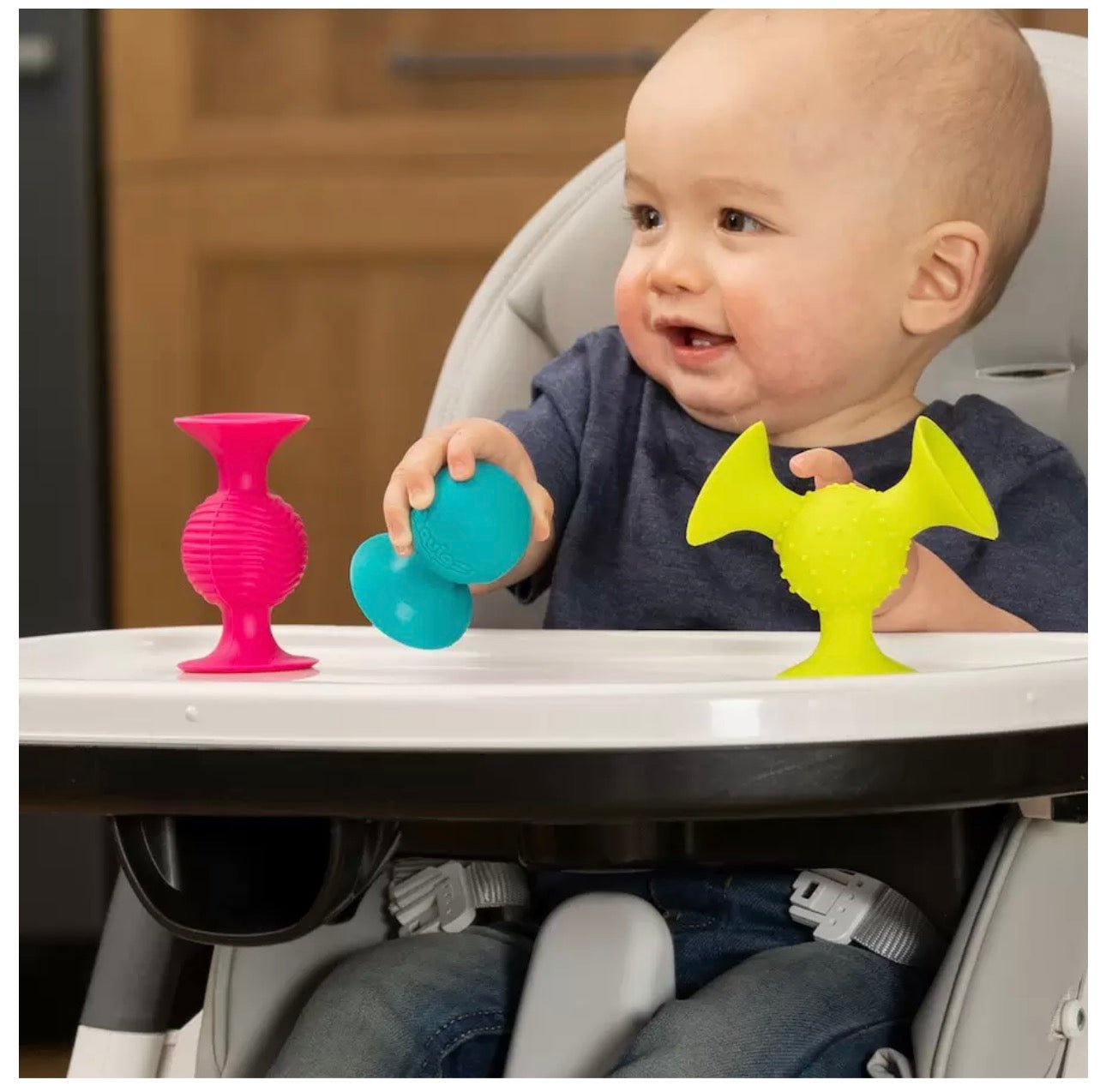 What happens when babies and toddlers encounter playful colors, fun sounds, fresh tactile experiences and super-suction? Meet pipSquigz, a set of three Fun Little Suckers for ages 6 months and up. Adored by baby and parents alike, pipSquigz are perfect for the stroller, highchair, bathtub, and anywhere travel. Simply push pipSquigz down onto any smooth surface and watch baby interact with this high-quality silicone suction toy. With super-suction, each shape can be tugged, pushed, shaken, and pulled. Or, push and stick the shapes together for new play experiences. Babies delight in the versatile movement, sound, and texture. Pediatricians note sensory integration as a crucial developmental milestone for infants. pipSquigz are right on target: The wavy ridges, bumps, and debossed, smiling face stimulate the fingers. The "just right" rattles and the POP of the suction cups thrill the ears while the brilliant colors mesmerize the eyes. pipSquigz is an all-in-one sensory learning experience! Not to mention, they're also wonderfully portable and completely dishwasher-safe. Discover peace of mind for parents and endless fascination for babies with pipSquigz.