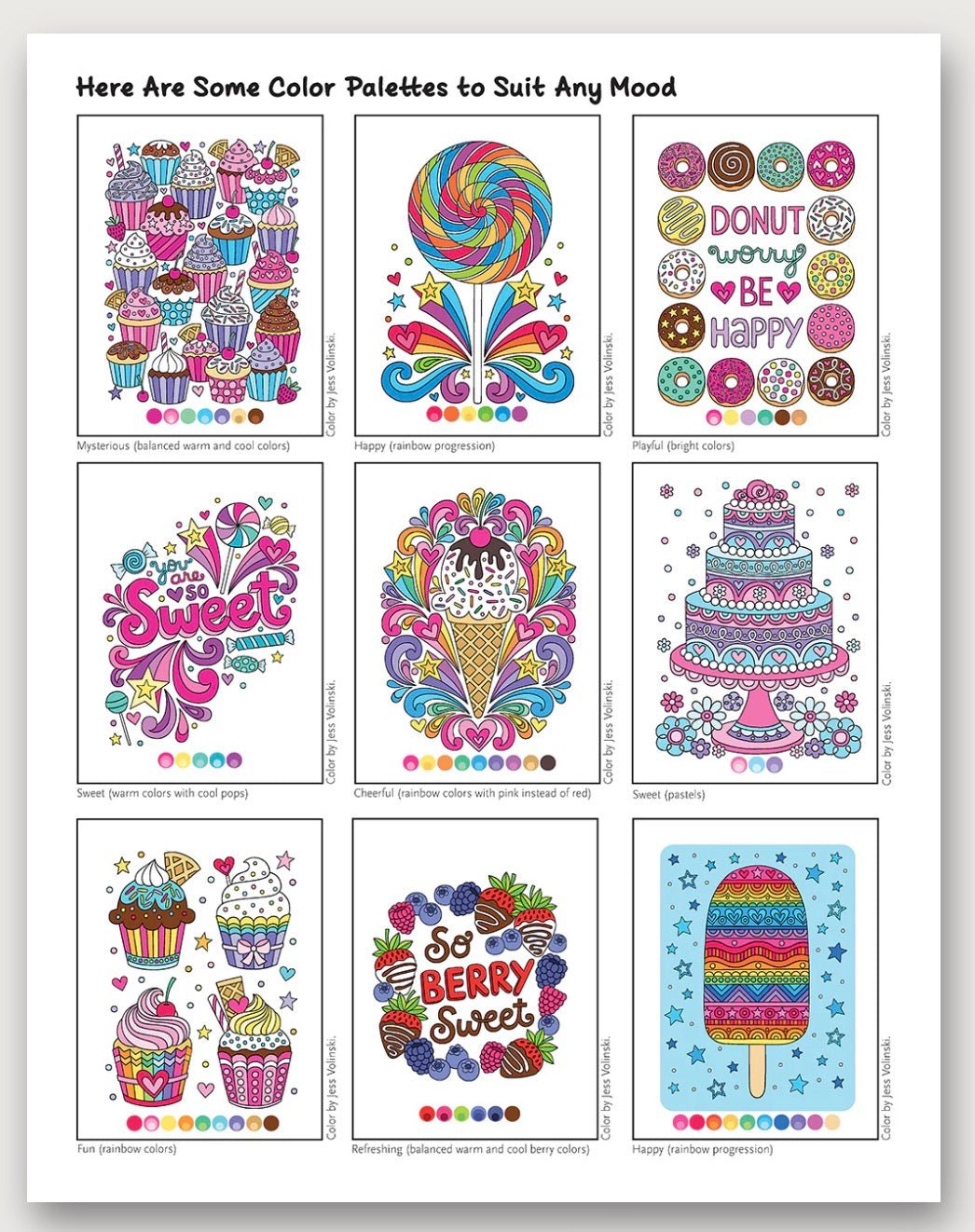 Coloring has never been so yummy! Youthful readers will find sweet inspiration inside this fun and engaging coloring book for tweens. From cupcakes and cannoli to gingerbread and gelato, these 32 scrumptious designs from talented Notebook Doodles® artist Jess Volinski offer empowering art activities for young girls. Jess also includes instructions on basic coloring techniques, fully colored examples, and motivational quotes to go with every design. All new “Let’s Explore Color” activities make coloring easy for beginners, with fully colored examples and help in choosing colors. Watercolors, colored pencils, markers, crayons, and gel pens will all look stunning on archival-grade, acid-free, 200-year paper. Each one-sided page is perforated, so when it's finished, it can easily be removed to hang up or give as a gift. This book has earned the DO Magazine Artist Fair Trade Seal of Approval.
