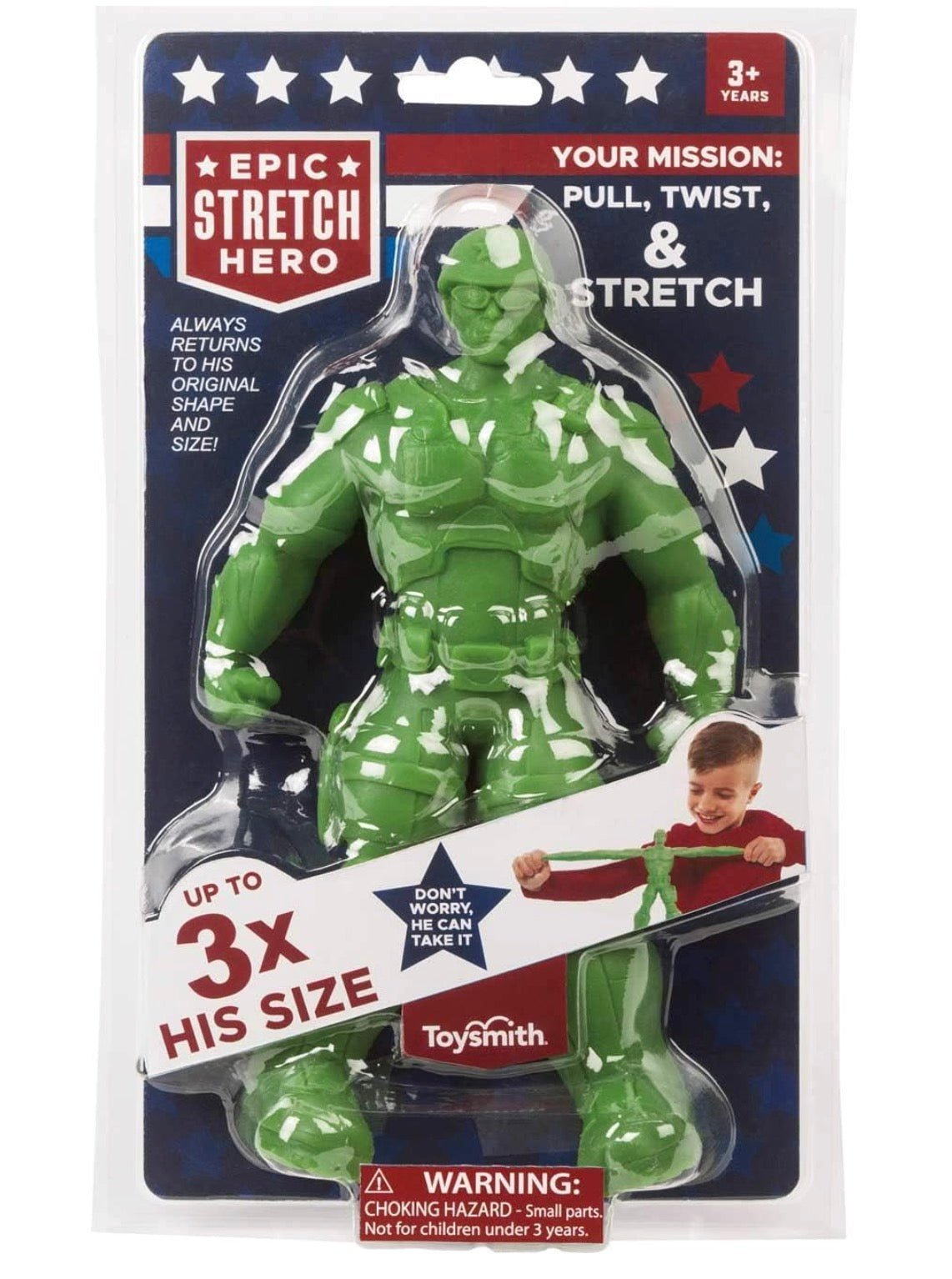 This stretchable military action figure can be pulled up to 3x his original size of 24 inches. Always returns to its original shape and form for continuous play and tactile engagement. Each soldier is neatly contained in a military-themed 10.24 x 5.91-inch blister packet. Packs of 8 blister cards are available to purchase. Available in green or blue. Perfect item for military-themed events, party stores, party favors, grab and go, and more.