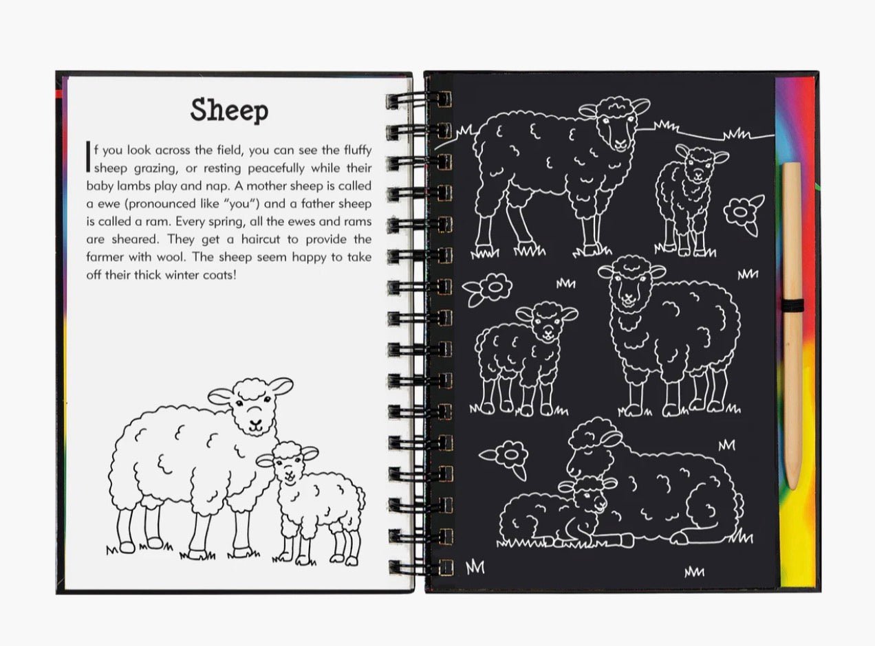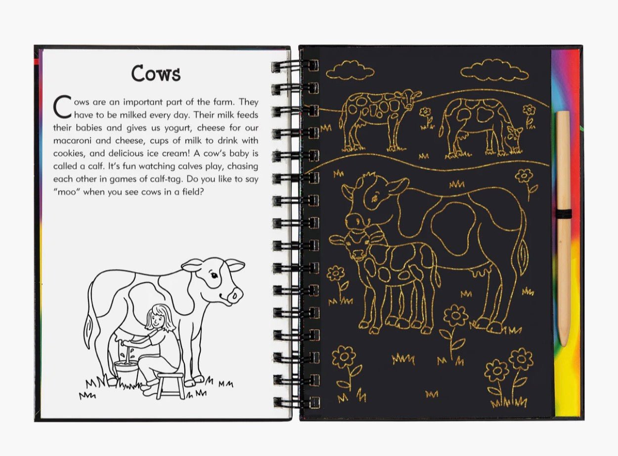 • Includes 20 farm scenes on black-coated glittery foil and colorful swirl scratch-off pages.