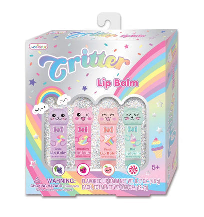 Get your pout on point with Critter Lip Balm! This pack includes 4 multi-colored lip balms, perfect for playful pampering. With a variety of cute critter characters to choose from, this set of children's cosmetics will keep lips hydrated and stylish. Packaged at 15 x 17 x 3, it's perfect for on-the-go cuteness!