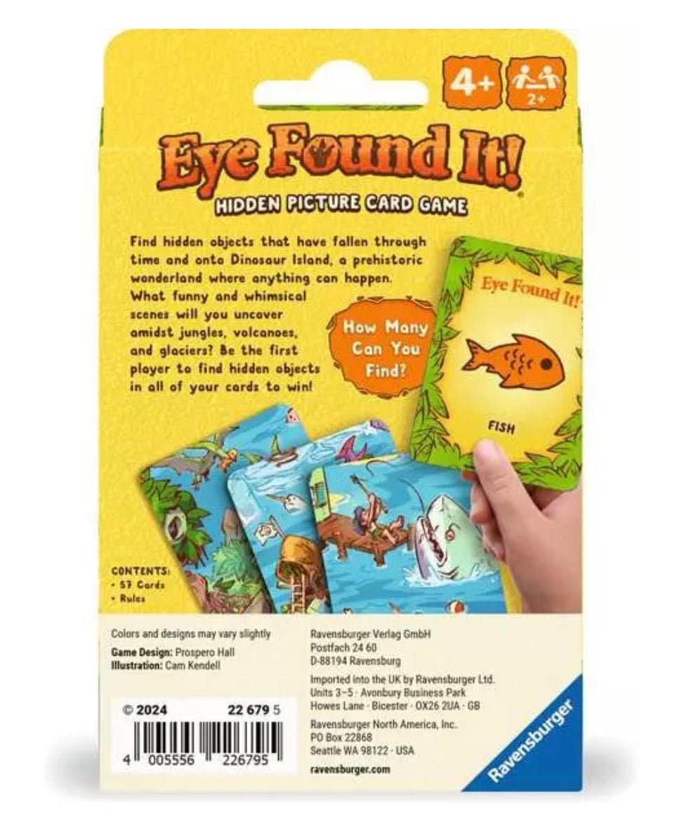 This compact, easy-to-carry game includes full-color cards full of whimsy and adventure. Search for hidden objects that have fallen through time and into Dinosaur Island, a prehistoric wonderland where anything can happen! A hidden object is revealed in each turn. Players search the illustrated cards in their hand for that object. The first player to find one discards that card, and the first player to completely empty their hand wins the game.