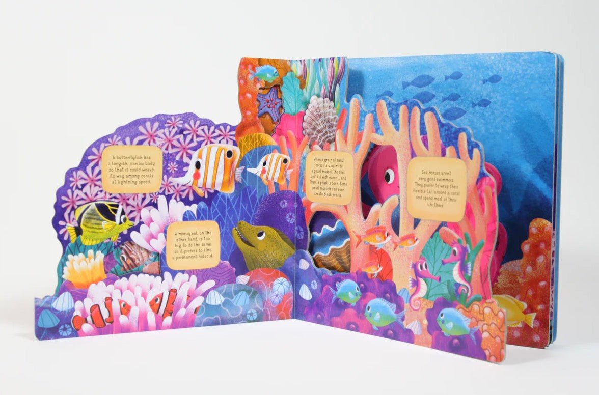 Have you ever wanted to dive into the ocean and swim with the fish among a beautiful coral reef? Now you can! A charming and vibrant picture book to take children into the sea and show them what life in a coral reef is like, this one-of-a-kind board book features dozens of adorable illustrations, educational captions, vocabulary words, cut-out accents, and hidden chambers to be revealed. From how fish sleep to how pearls are made, learn all about an incredible coral reef and the sea animals that inhabit it, from starfish and sea horses to eels, clownfish, water snakes, and so much more. Young readers are sure to be amazed as they learn about the ocean and the remarkable life that lives in it!