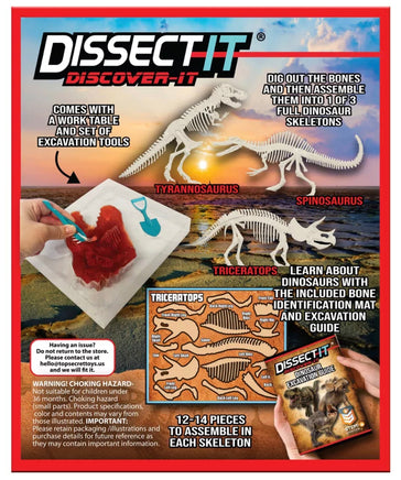 DISSECT-IT KIT INCLUDES: 1 dig pit, 1 set of bones, 1 shovel/scraper, 1 scalpel/tweezer, and 1 learning guide.