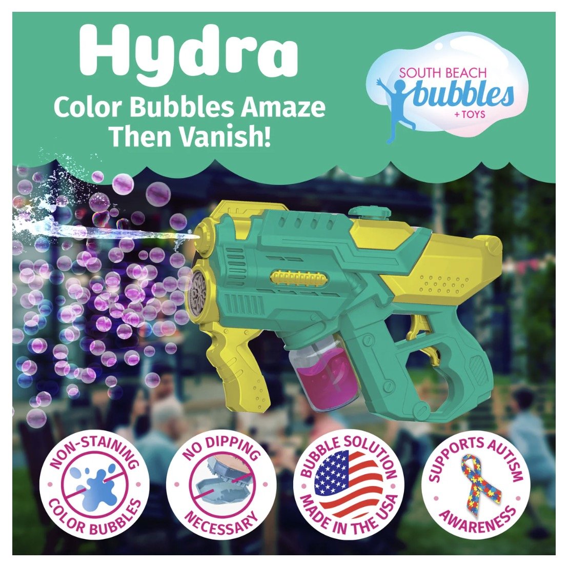 Introducing PoppinColorz Hydra 2025 TOTY WINNER (Outdoor Toy of the Year Award by the Toy Association): the ultimate 2-in-1 Color Bubble Blaster and Water Blaster, with bubbles proudly made in the USA! With 2 Color Bubble Liquids and 4 Clear Bubble Solutions, the fun never ends. No dipping is required, no spills for toddlers, just magical color bubbles that will vanish.