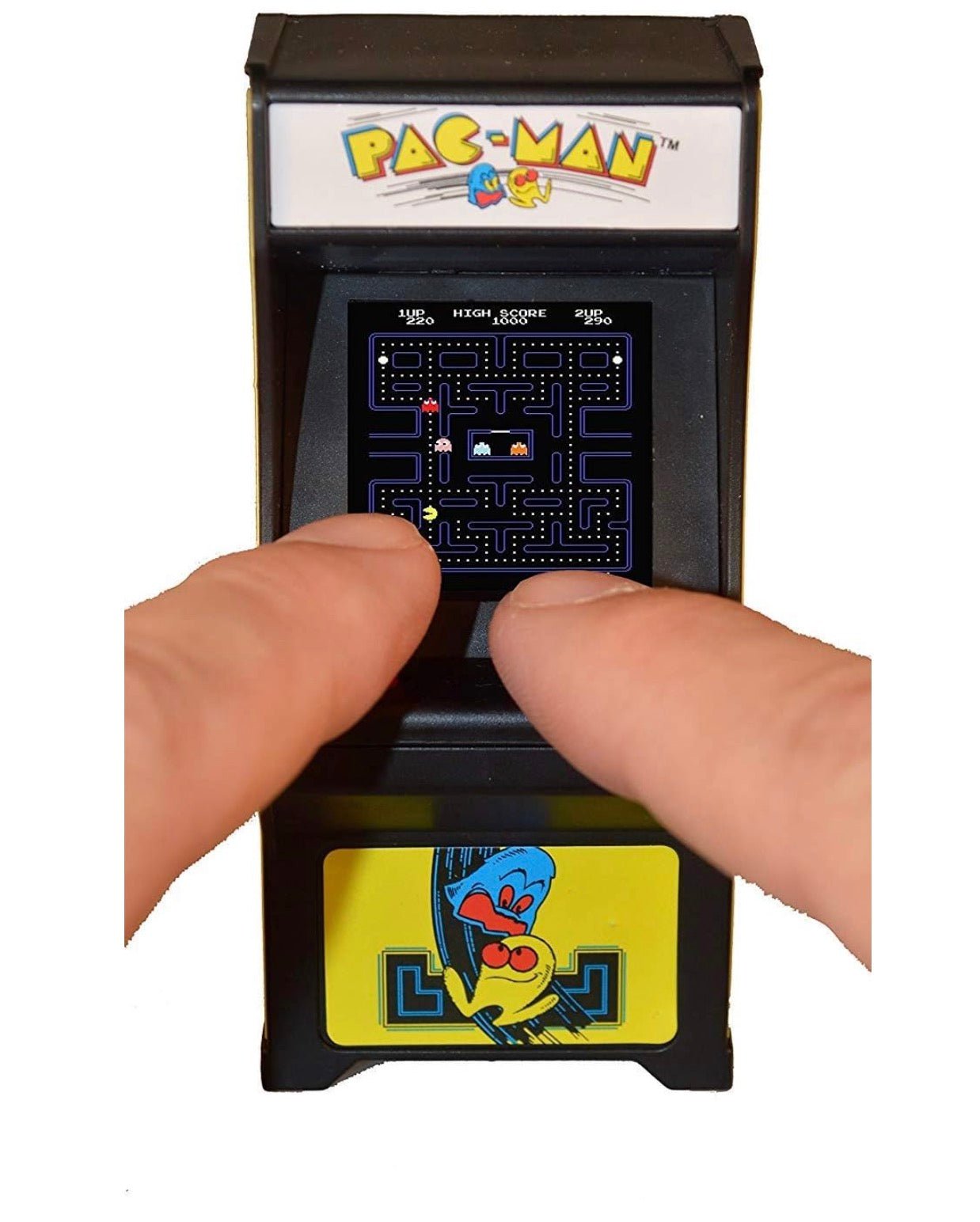 - Pac-Man magic, now in a bite-sized arcade! Pac-Man magic, in a bite-sized arcade! The 3.5" mini Pac-Man video game fits right in the palm of your hand. Features fully functional buttons and joystick with LED screen and game play sounds. The same classic game, right at your fingertips!