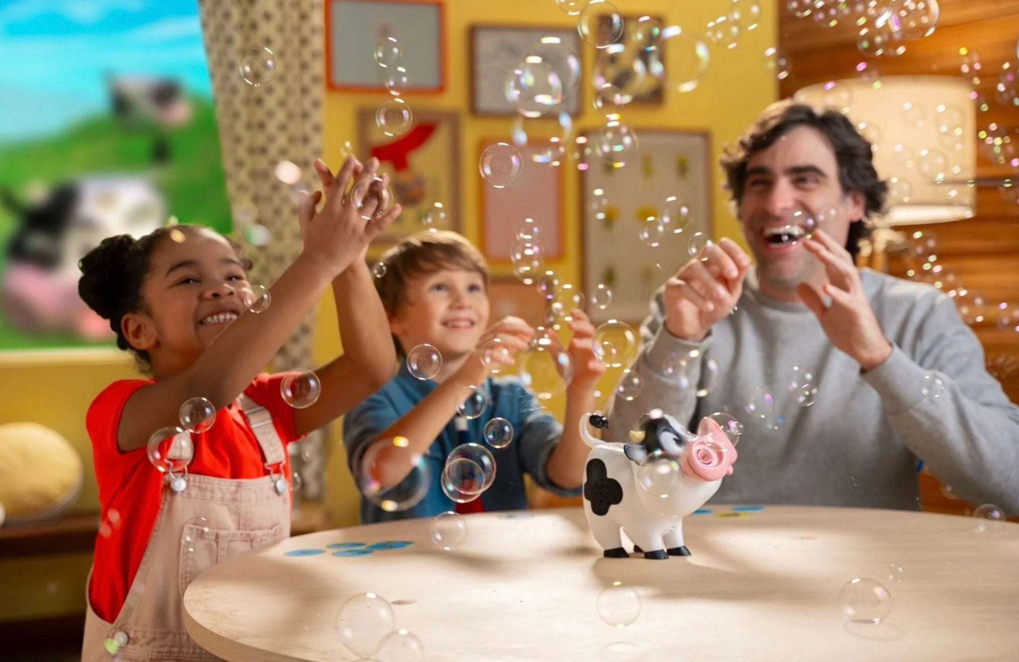 - Includes 1 Moo Moo the Cow, 15 Cards, 1 Poo Token, 75ml Bubble Solution, and Complete Instructions – requires 3x AAA batteries (not included)