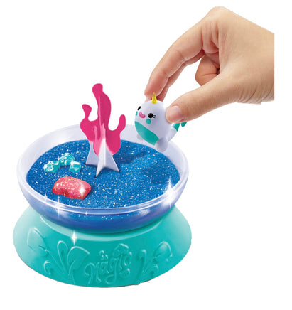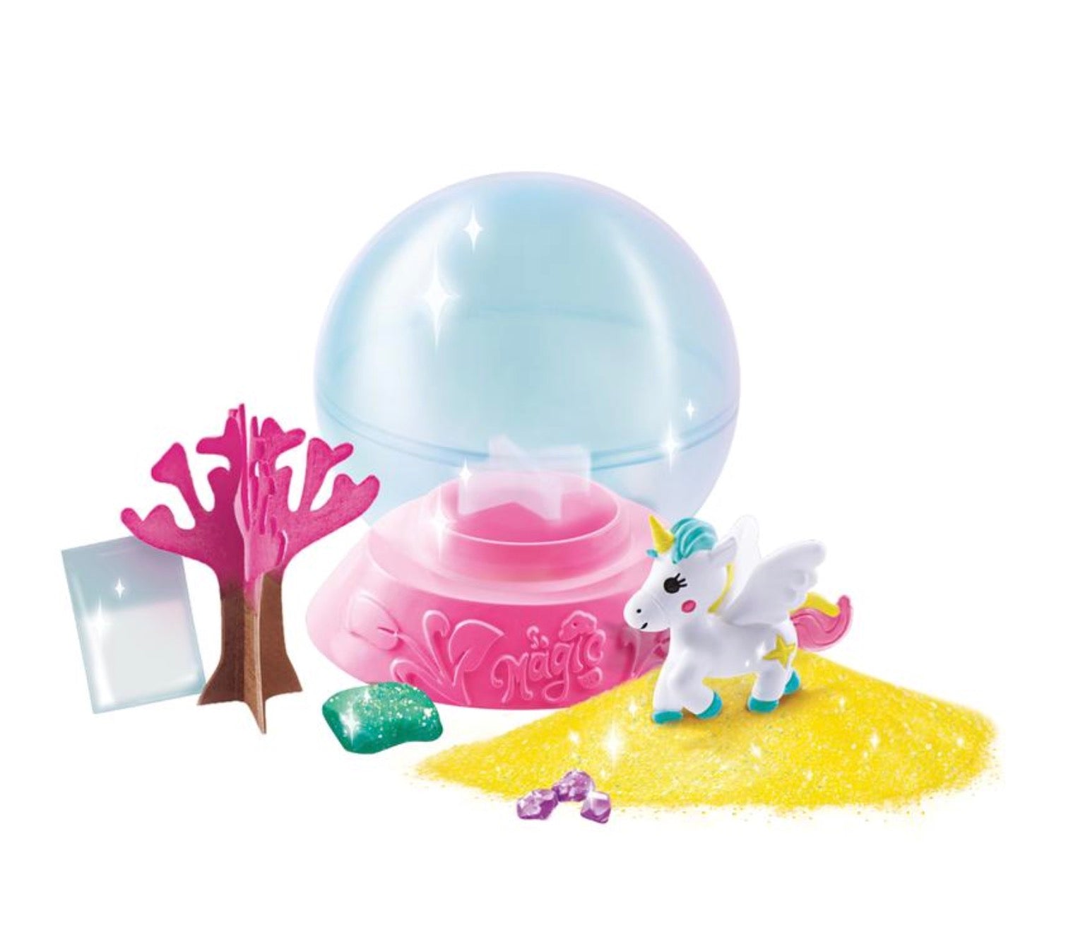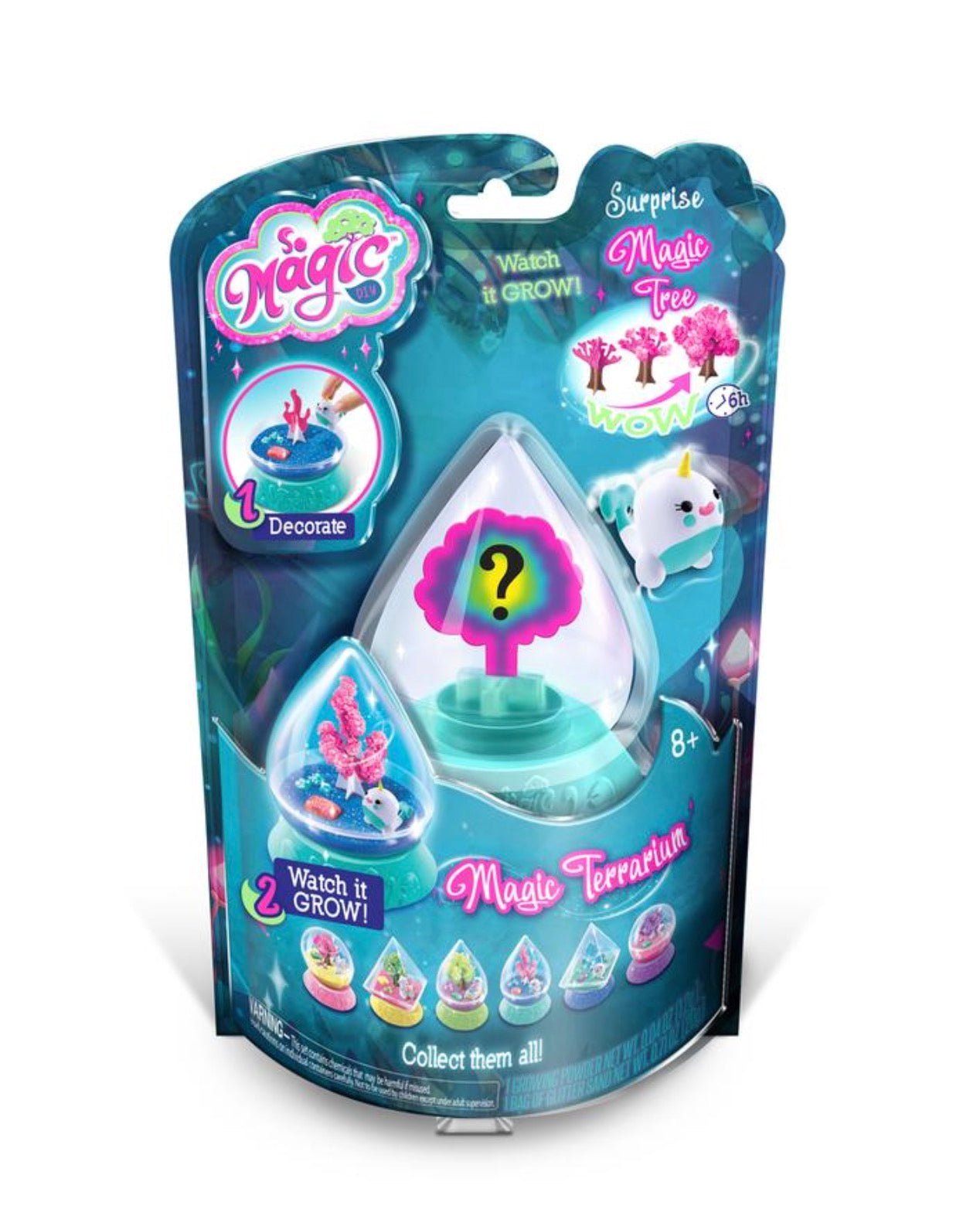 - Contains 1 plastic terrarium container and base, 1 paper Magic Tree, 1 bag of Growing Power, 1 bag of Glitter Sand, 1 Character Figure, 1 Glitter Stone, 3 Small Glitter Stones, and Instructions.