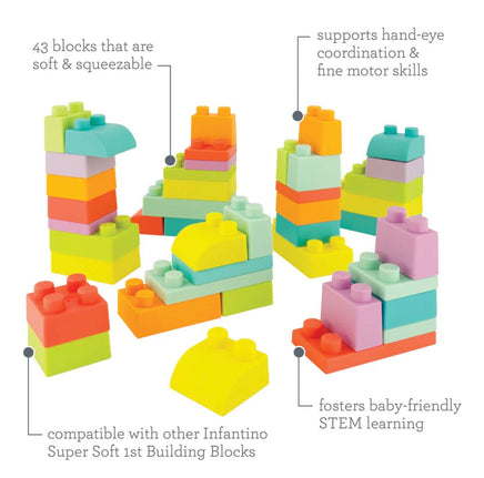 Introduce your little one to the joy of building and creativity with the Infantino Super Soft 1st Building Blocks Jumbo Playset. Designed to be a parent's and baby's favorite, this jumbo 43-piece set offers lots of play possibilities. These blocks are crafted to be super soft and gentle on your baby's delicate hands—and your feet! Whether stacked high or played with individually, these must-squeeze blocks provide a sensory delight that your baby will love.